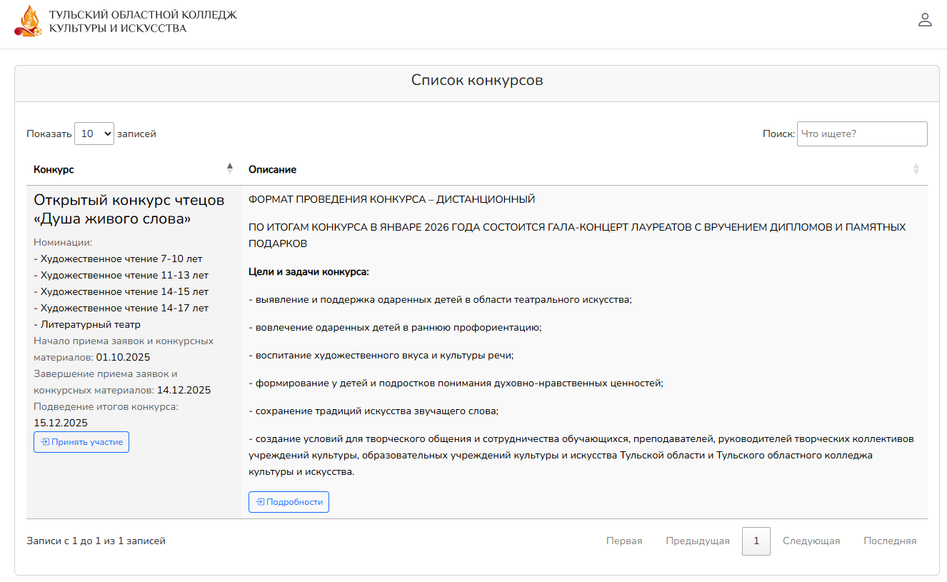 На главной странице сайта отображается список актуальных и прошедших конкурсов, подробная информация о них. Вы можете воспользоваться поиском, для выбора действия имеются две кнопки: