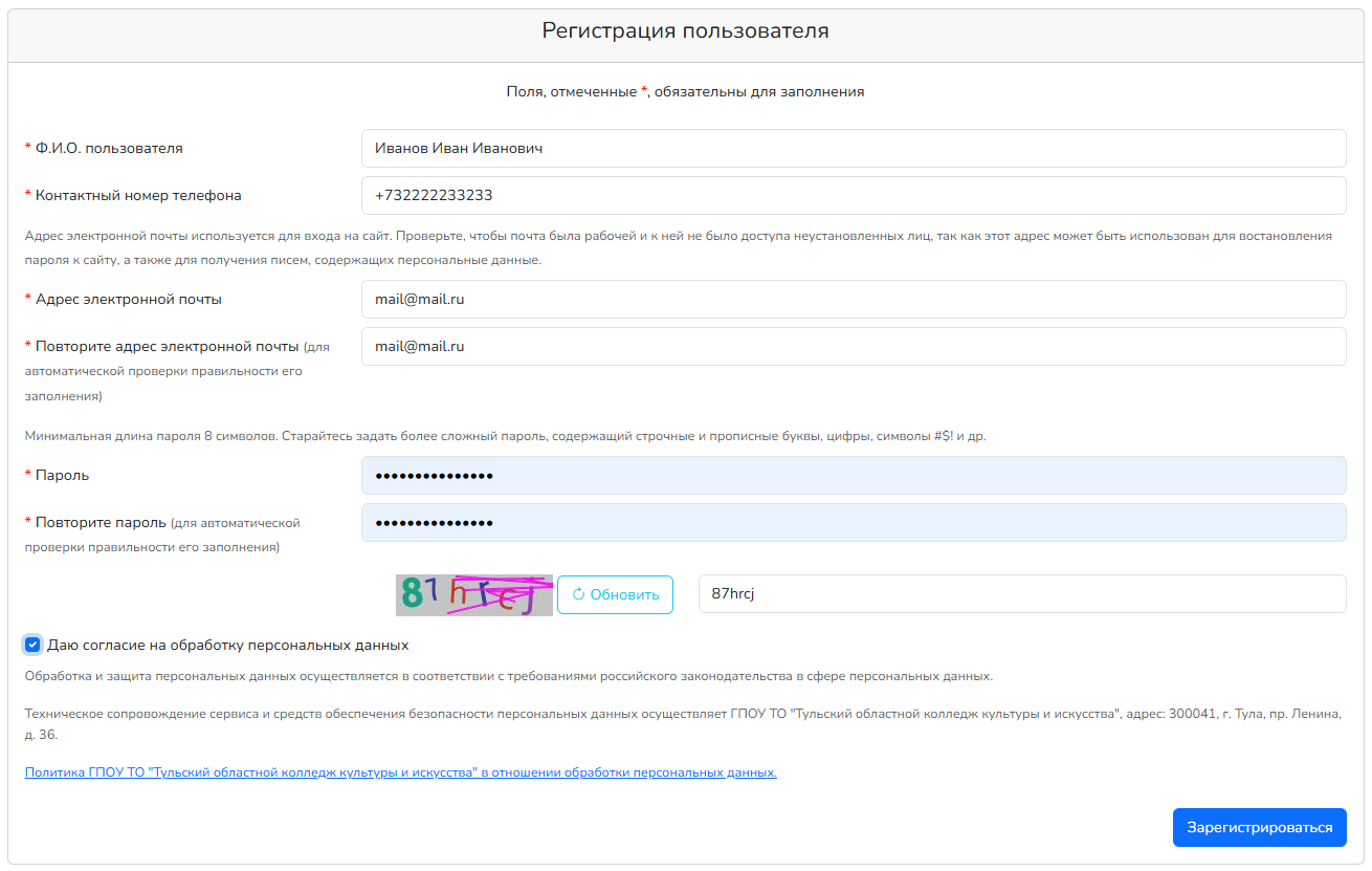 Заполните регистрационную форму, следуя подсказкам на странице.