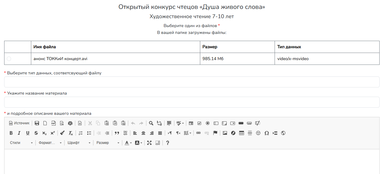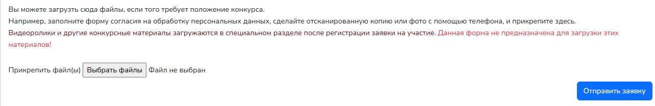Форма анкеты не предназначена для загрузки конкурсных материалов. Максимальный размер загружаемых файлов - 10 мегабайт.