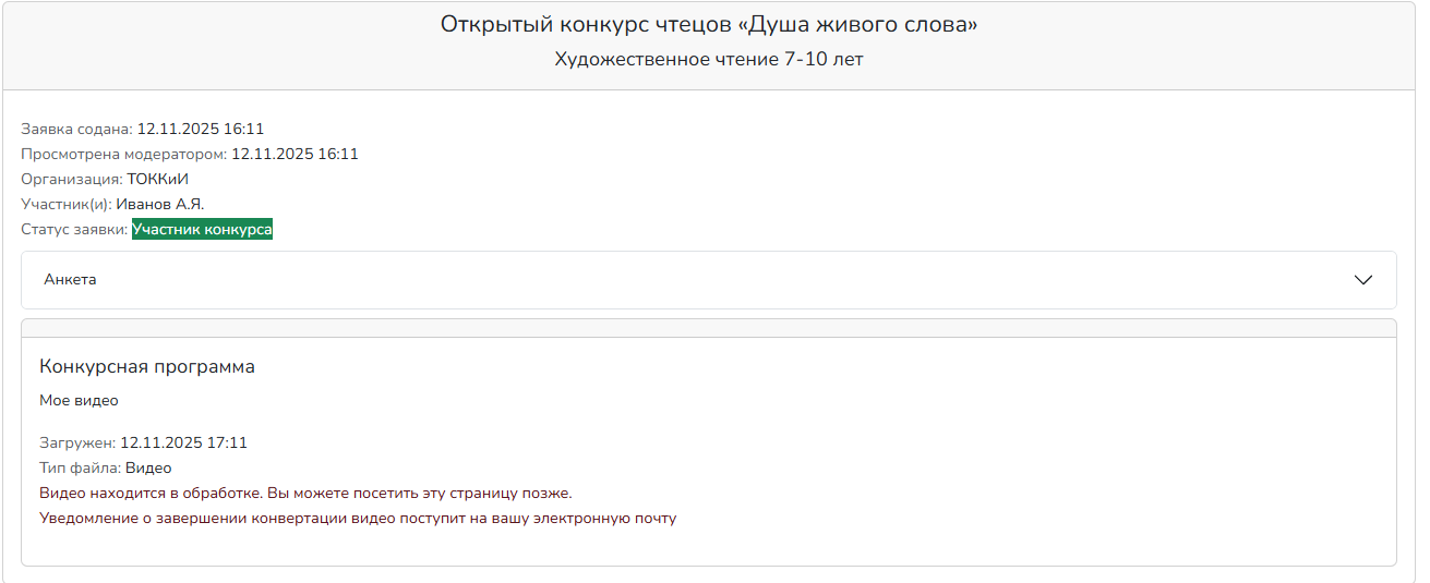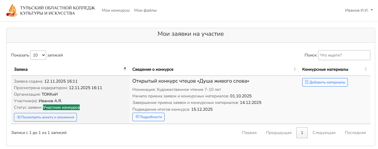 После успешной загрузки перейдите в раздел "Мои конкурсы", выберите конкурсную заявку и действие в ней "Добавить материалы".