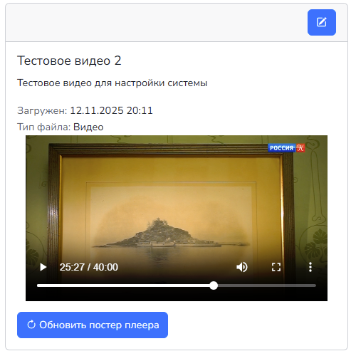Кнопка "Обновить постер плеера" предназначена для изменения изображения видео на начально этапе. Изображение гененируется случайно, на основе кадров из видео. Загрузка заранее подготовленного постера не предусмотрена.