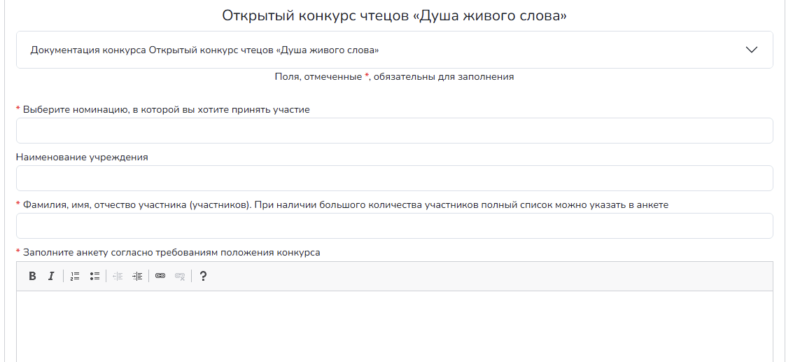 Прежде чем заполнять анкету - внимательно ознакомьтесь с документацией конкурса. Если вы представляете коллектив, то Ф.И.О. всех участников не нужно указывать в соответствующем поле - для этого есть поле "Заполните анкету согласно требованиям положения конкурса". Название организации, номинация и другие парметры в анкете нужно будет продублировать. Заполняйте анкету в точности так, как это указано в положении конкурса.