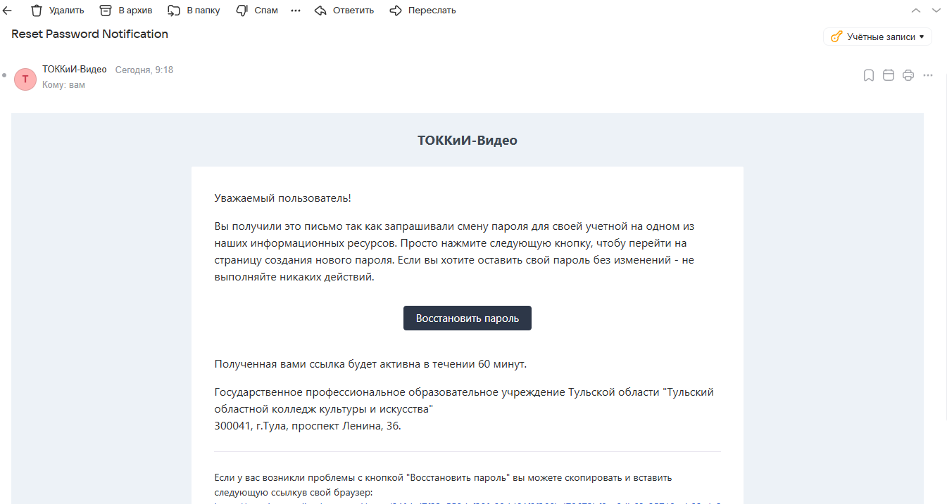 Reset Password Notification – заголовок (тема) письма. Для восстановления пароля воспользуетесь кнопкой «Восстановить пароль» или ссылкой в тексте письма.