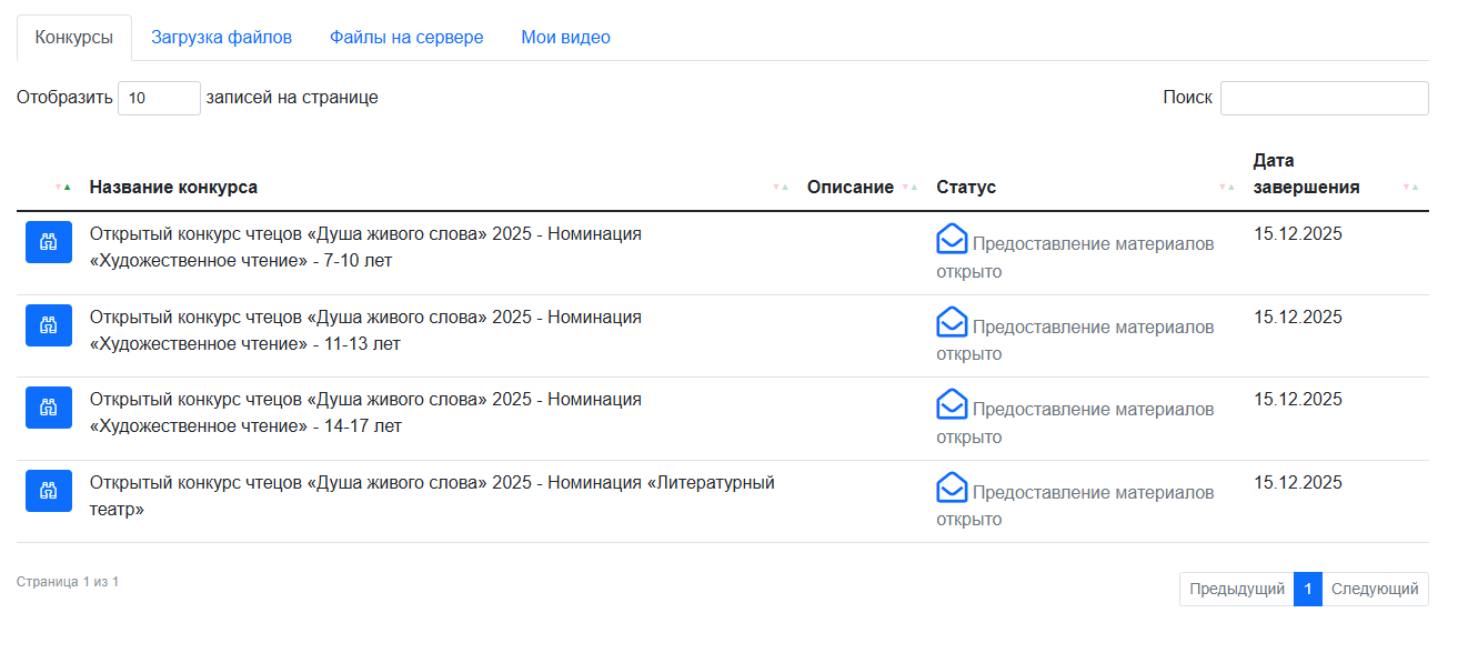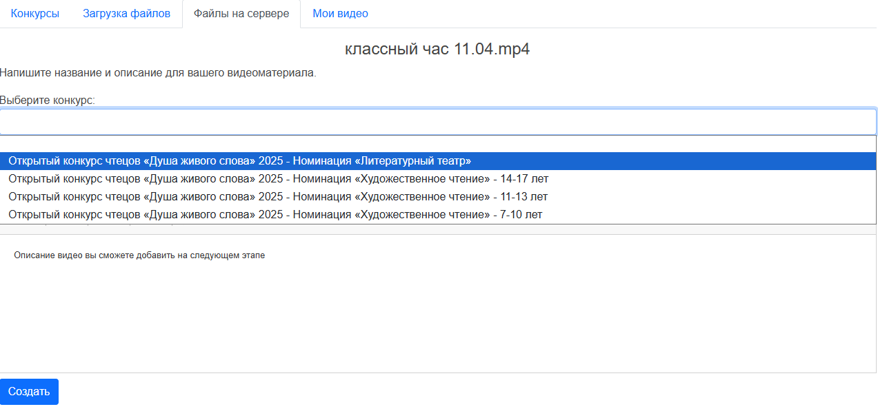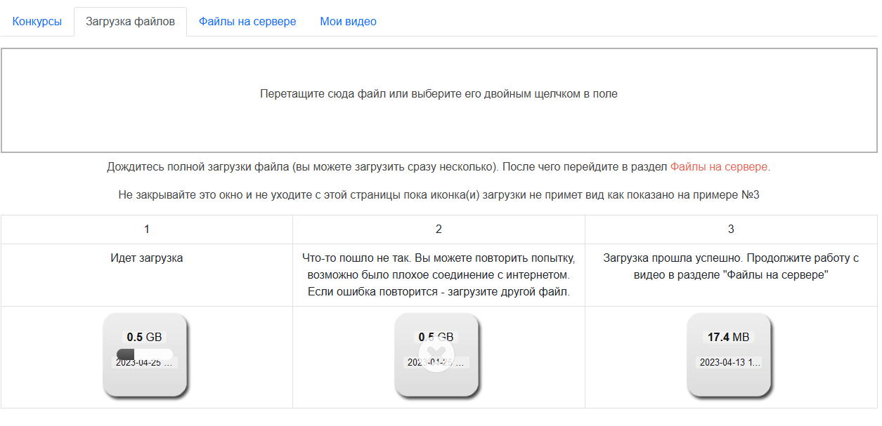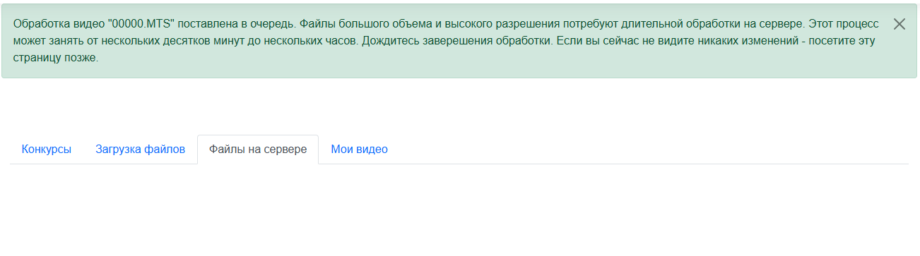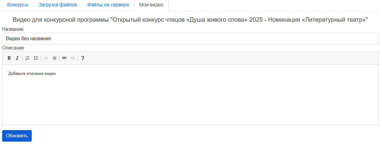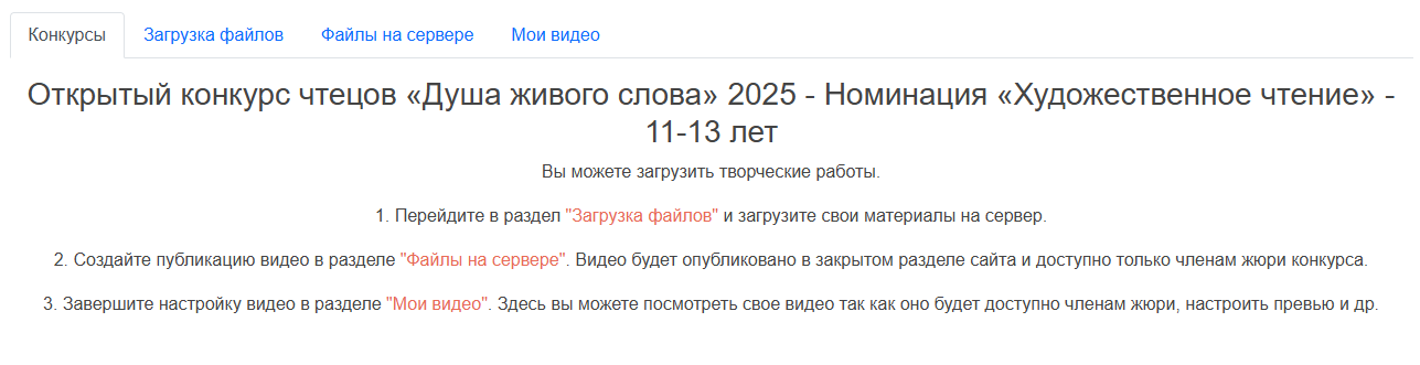 После входа в систему вам будут доступны разделы: Конкурсы, Загрузка файлов, Файлы на сервере, Мои видео.