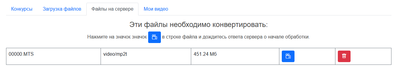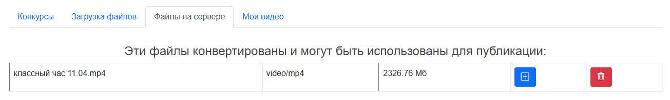 Конвертированные файлы группируются под заголовком «Эти файлы конвертированы и могут быть использованы для публикации». Нажмите на кнопку , чтобы создать публикацию видео в программе конкурса. Видео будет опубликовано в закрытом разделе сайта и будет доступно только членам жюри конкурса.