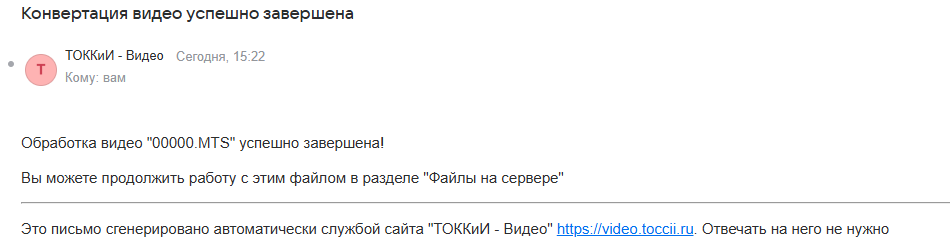 Дождитесь завершения процесса конвертации файла. Этот процесс может занять длительное время, в зависимости от размера видеофайла, его разрешения, длительности, а также нагрузки на сервер. По завершении процесса вы получите сообщение на электронную почту.